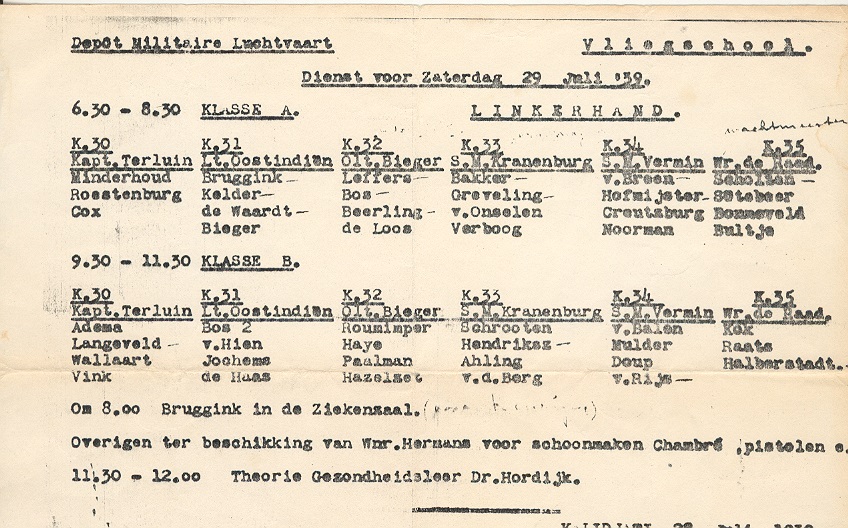 Er direct een schema gepresenteerd waarop de namen van de leerling-vliegers die zouden gaan vliegen op de Koolhoven FK-51 trainer er werd continu gevlogen op de basis de jongens moesten zo snel mogelijk hun klein brevet halen om door te gaan op de werkelijke gevechtstoestellen. zoals jagers en bommenwerpers.